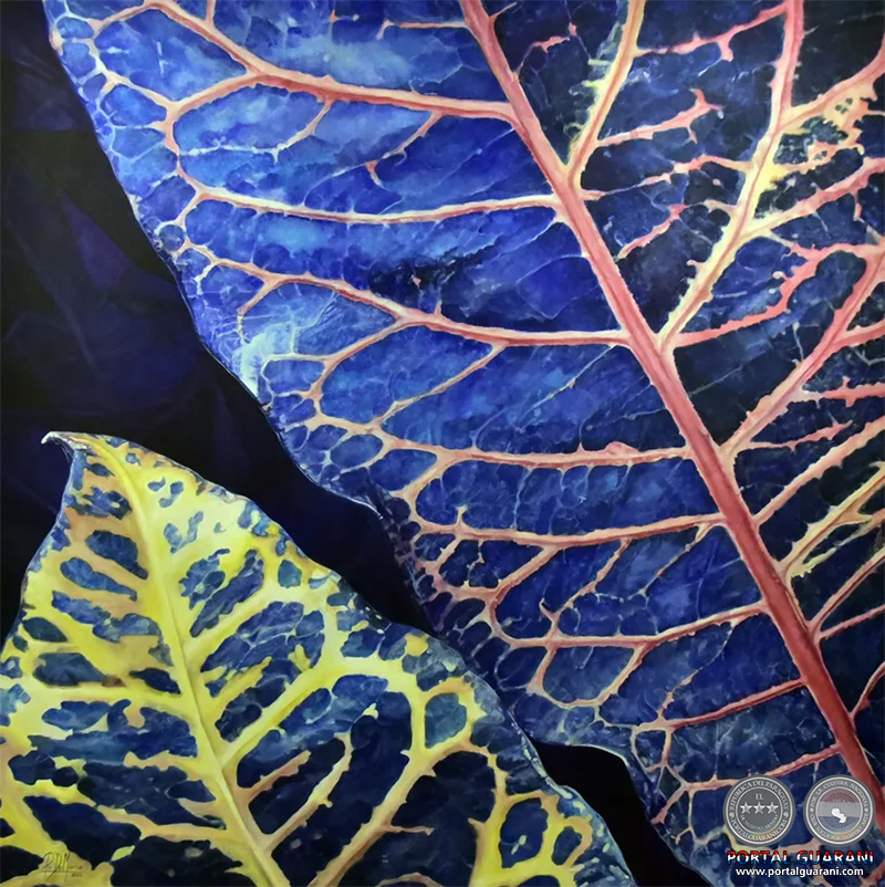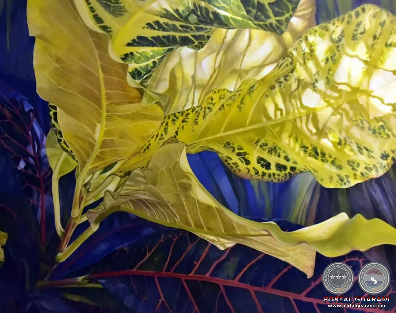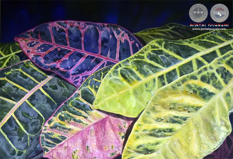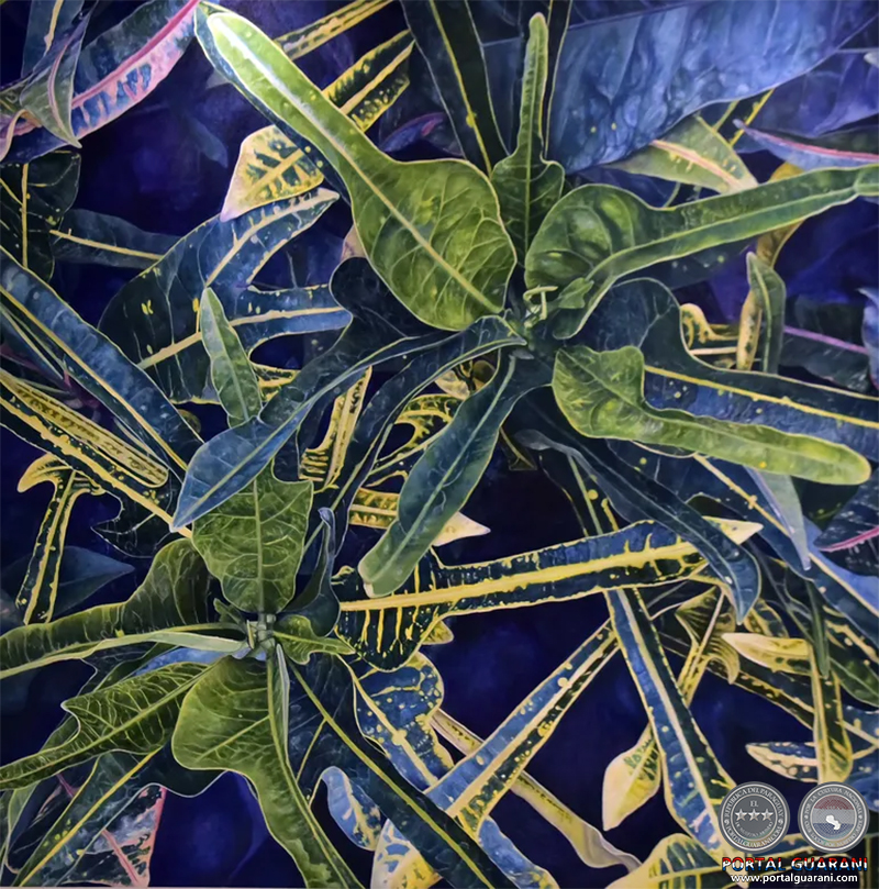 Figurativo y realista, el crotón es analizado con detenimiento. “Para mí, aunque no es una especie nativa del Paraguay, el croto representa al Paraguay, representa al jardín paraguayo”, enfatiza la artista. Crece con exuberancia, no necesita casi cuidado y está en casi todos los hogares, dice la artista sobre su modelo.