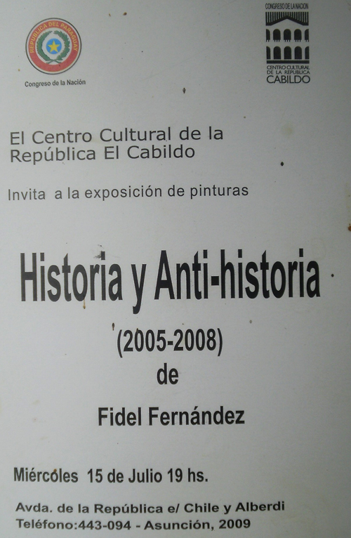 El Centro Cultural de la República El Cabildo se encuentra habilitada desde el miércoles 15 de julio, la muestra “HISTORIA-ANTIHISTORIA 2005-2008”, pinturas de gran formato de Fidel Fernández, en la Sala de Exposiciones Temporales.