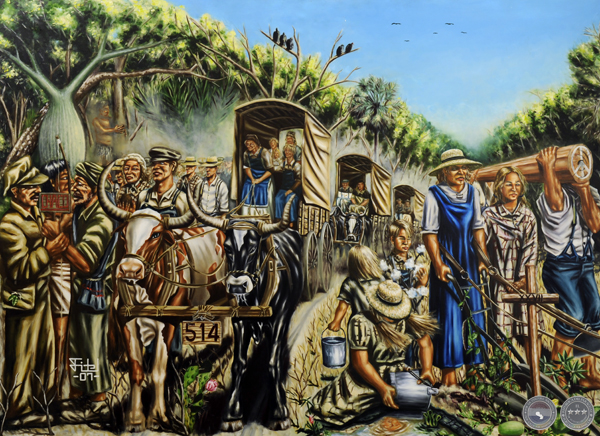 La muestra está compuesta por quince pinturas al óleo sobre lienzo, de gran tamaño, entre ellas: FUNDACIÓN DE ASUNCIÓN (2.00m x 1.50m), JESUITAS (1.80m x 1.30m), INDEPENDENCIA (1.85m x 1.65m), RODRÍGUEZ DE FRANCIA (1.85m. x 1.40m), ACOSTA ÑU, (1.20 m x 1.60m); MUERTE DEL MCAL LÓPEZ, (1.65m x 1.20m), MENNONITAS (1.90m x 1.40m), MENSÚ, (1.70m x 1.35m), GUERRA DEL CHACO (1,70m x 1.20m), REVOLUCIÓN DEL ’47 (1.60m x 1.10m), PAZ Y PROGRESO (1.80m x 1.40m), NOCHE DE LA CANDELARIA, (1.95 x 1.30m), CAMINO SEGURO (1.95m x 1.50m), CATEURA (1.85m x 1.45m), UN DÍA DE CAMPO (1.45m x 1.90m).