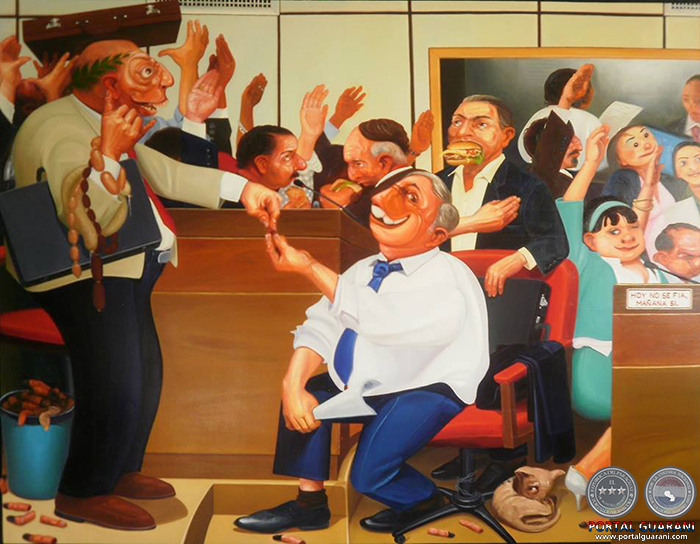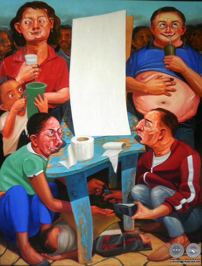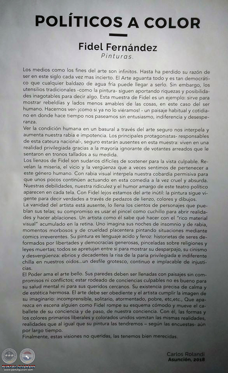 El Poder ama el arte bello. Sus paredes deben ser llenadas con paisajes sin compromisos ni conflictos; estar rodeado de conciencias culpables no es bueno para su salud mental ni para sus queridos cercanos. Su existencia precisa de calma y de estética hermosa. El arte debe ser obediente y el artista cumplir la imagen de su imaginario: incomprensible,solitario, atormentado, pobre, etc,etc., Que aparezca en escena alguien como Fidel rompe su esquema cómodo y mueve el caballete de su conciencia y de paso, de nuestra conciencia. Con él, las formas y los colores primarios liberales y colorados unidos vomitan las mismas realidades, realidades que al igual que su pintura las tendremos – según las encuestas- aún por largo tiempo.