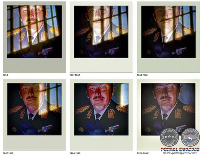 un retrato coloreado y con relieve, estampado sobre plástico, de un primerísimo primer plano del dictador vestido con uniforme militar de gala. El objeto, barato, impreso como para ser distribuido masivamente, pudo bien o descontarse del sueldo de funcionarios públicos, maestros nacionales, policías y militares, o entregado durante las campañas electorales, en las que más que demostradamente terminaba ganando siempre por una mayoría abrumadora. Concebido para ser encuadrado, se esperaba que, más que un adorno, su presencia “santifique” y expulse toda sombra de duda sobre la lealtad de una familia paraguaya hacia su “Único Líder”.