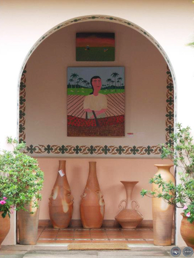 Genoveva, la igualmente amable esposa de Jenaro, le ayuda a sacar los cuadros del taller para las fotos. Jorge Antonio, su travieso pero amoroso nieto de 3 años -que vive con los abuelos- quiere mostrarme sus “cartones”. Él también pinta! Solo me permite quitarle la foto cuando pose en plan de “pintor en serio” para señalarme su pintura abstracta! Si no, no hay caso, no quiere para nada que se le fotografíe!
