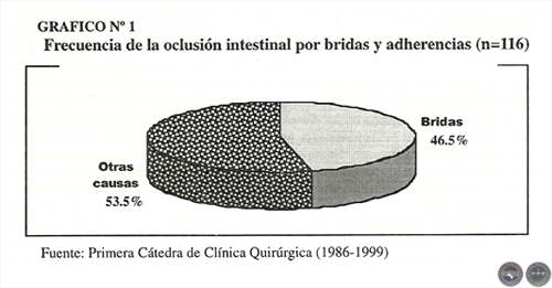 Los 56 pacientes con bridas postoperatorias, sobre el total de 116 casos de oclusión del intestino delgado, representan el 46,5 % (Gráfico 1).