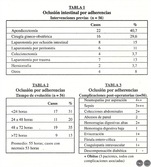 Las adherencias postoperatorias representaron el 46.5 % de todas las causas de oclusión intestinal. El 40 % de los pacientes refirió la apendicectomía como antecedente, el 30 % una cirugía gineco-obstétrica, el 15 % una oclusión anterior y el 15 % restante laparotomías por causas diversas. El tiempo de evolución fue igual o menor a 48 horas en el 50 % de los casos. Cuarenta y cinco pacientes fueron tratados con la simple liberación de la adherencia, mientras los 11 restantes, con similar tiempo de evolución, tenían necrosis del asa estrangulada y fueron sometidos a una resección intestinal. Las complicaciones postoperatorias - observadas en 10 pacientes - consistieron fundamentalmente en neumopatías, sepsis y colecciones purulentas intra abdominales; ellas aparecieron en el 13 % de los casos en ausencia de necrosis intestinal y en el 36 % en presencia de necrosis. Fallecieron 3 pacientes (5.4 %): 2 del grupo sin necrosis (4.4 %) y 1 del grupo necrosis intestinal (9 %).