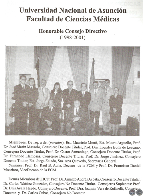 Dres. Alejandro Chirife, Luis Carlos Máas, Dr. Federico Muñoz, Dr. Rubén Aguirre, Dr. Washington Renna, Dr. Amado Adorno, Dr. Luis A Richer, Dr. Modesto Mercado, Dr. Eduardo Anmatuma, Dra. Melania Brítez de Frutos, Dr. Rafael Swartzman, Dr. Miguel Ángel Romei, Dr. Luis A Ramírez, Dr. Emilio Costanzo, Dr. Juan Adolfo Cattoni, Dr. Carlos Vera Martínez, Dr. Domingo A. Masi, Dr. César Villalón Palma, Dr. Manuel Frutos, Dr. Carlos Cassattí, Dr. Vicente Martínez, Dr. César Adorno, Dr. Darío Isasi Fleytas, Dr. Andrés Rivarola, Dr. Hugo Peña, Dr. Abelardo Ayala, Dr. Antonio Montalto, Dr. Juan Boggino, Dr. Alfredo Ayala Haedo, Dr. Rodolfo Monges, Dr. Leandro Pereira, Dr. Miguel González Oddone, Dr. Julio César Chenú Bordón, Dr. Darío González Vera, Dr. Carlos Olmedo, Dr. Ángel R. Ginés, Dr. Vicente Chase Sosa, Dr. Diógenes Mazó Martínez, Dra. Leonilde Romagnoli de Ayala Haedo, Dr. Joaquín Roy, Dr. Vicente Mayor, Dr. Julio Manuel Morales, Dr. Andrés Gubetich, Dr. Carlos Martínez, Dr. Alcibíades Alvarez, Dr. Antonio Bestard, Dr. Luis Alberto Garcete, Dr. Enrique Weiler, Dr. Sebastián Díaz Roy, Dr. Manuel Riveros, Dr. Carlos A. Riart, Dr. Ramón Méndez Chamorro, Dr. Roberto Bogado, Dr. Pablo Heikel, Dr. Eusebio Villamayor, Dr. Quirno Codas Thompson, Dr. Santiago Pastore, Dr. Enrique Zacarías, Dr. Carlos Valiente, Dr. Francisco Semidei, Dra. Aida Olivari, Dr. Rufino Gorostiaga, Dr. Manuel Pérez Recalde, Dr. Telmo Aquino, Dr. Ramón Jiménez Gaona, Dr. Juan S. Netto, Dra. Julia Godoy, Dr. Manuel Giménez, Dra. Perfecta Torales de Tórtora, Dr. Ramón Prieto, Dr. Tomás Sánchez Zorrilla, Dr. Marcos Villamayor, Dr. Carlos Alvarez, Dr. Silvio Báez, Dr. Gerardo Buongermini, Dr. Guido Rodríguez Alcalá, Dr. Venancio Pino, Dr. Alberto Simón, Dr. César Sarubbi, Dr. Ricardo Caballero, Dr. Silvio Rodas, Dr. Mario Luis de Finis, Dr. Gustavo Vera Vargas, Dr. Guillermo Brañas, Dr. Emilio Cubas, Dr. César Gagliardone, Dr. Fernando Vallejos, Dr. Juan Francisco Recalde, Dr. Juan Max Boettner, Dra. Elisa Guerreros, Dr. Emilio Velilla, Dr. Leandro Raúl Peña, Dr. Santos Baudo, Dr. Ángel Morassi, Dr. Domingo Pessolani, Dr. Gustavo Vásquez, Dr. Héctor Ruiz, Dr. Delio Fariña, Dr. Nelson Llamosas, Dr. José Soljancic, Dr. Abraham Knallinsky, Dra. Edelira González de Díaz Roig, Dr. Enrique Dávalos, Dr. Jorge Codas Thompson, Dr. Francisco Montalto, Dr. Alejandrino Lobos, Dr. Juan Romero, Dr. Julio Teodoro Decoud, Dr. Eduardo Gould, Dr. Crispín Insaurralde, Dr. Rogelio Álvarez Bruguez, Dr. Víctor Boettner, Dra. Asunción Vall, Dr. Armindo Riquelme, Dra. Hilda Lezcano, Dr. Federico Ramos Fretes, Dr. Gustavo González, Dr. Pacian Andrada, Dr. Jacinto Riera, Dr. Ramón Doria, Dr. Justo P. Vera, Dr. Víctor I. Franco, Dr. Eduardo Rodríguez.