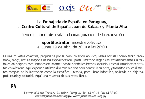 SPORTILUSTRATOR es una muestra colectiva de ilustradores y artistas visuales, se trata de jóvenes que cuentan con mucho talento y originalidad a la hora de poner imágenes a las palabras. Esta muestra conjunta tiene su origen a través de la comunicación por redes sociales de Internet como: flickr, facebook, blogs, etc. La mayoría de los expositores mantienen vivas sus páginas casi cotidianamente con sus nuevos trabajos desde donde los hemos seguido. La diversidad y el número de jóvenes que dedican su tiempo actualmente a este campo expresivo nos fue muy llamativo, así comenzamos a juntarnos por espacio/tiempo a conocernos o reencontrarnos, mostrar los trabajos de ilustración que cada uno hace con el fin quizá de realizar una muestra colectiva, donde las distintas manos, con sus distintas técnicas y soportes se encuentren, así: graffiti, objetos, dibujos, videos, pintura, impresiones digitales, plotter, gofrado, collage, calado, etc. Acercando al público sus peculiares maneras de contar cosas que pasan o que las inventan de pura gana cada uno, una búsqueda personal de calidad estética y narrativa.