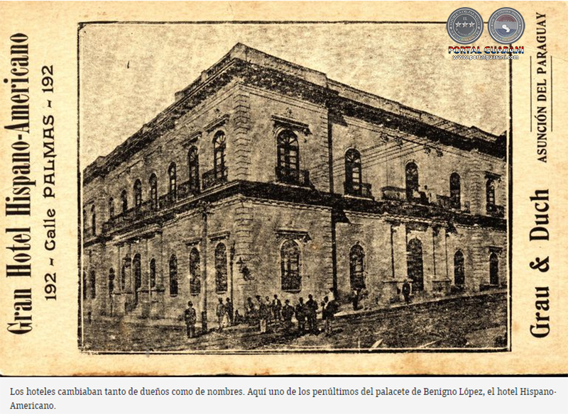 En el caso del palacio de Venancio López, fue ocupado por las tropas brasileñas en 1869, lo convirtieron en el Hospital da Marinha Brasileira hasta 1876. De allí quedaba cerca llevar en tranvía los muertos hasta el cementerio del Mangrullo. El “hospital cue” pronto se convirtió en un nido de marginales y antro de prostitutas. Fue llevado a remate y se convirtió sucesivamente en Hotel Argentino, Hotel Franco-Argentino, Hotel Cosmos y Asunción Palace Hotel. Ofrecía en sus avisos “tranvía en puerta”, “mucho aseo y buen trato, cocina de familia” o bien “cocina cosmopolita, iluminación y timbres eléctricos”.