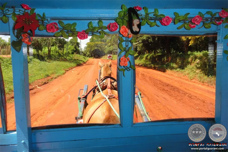 El colorido carumbé se desplaza sobre la roja cinta que une Villarrica con Itapé, antes de la llegada del asfalto.
