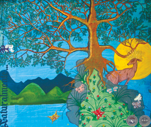 At first glace, Ocampos’ paintings have a sense of simplicity inherent in the naïve style in which he paints. But on closer examination, the viewer discovers not only more complex themes and subject matter, but hidden words, phrases, quotes and even bible verses that the artist has handwritten throughout. Delicately etched to outline a character or hidden in the branches of a tree or whiskers of a cat, the literary references are joyous surprises to the viewer who ventures close enough to find them within the painting.