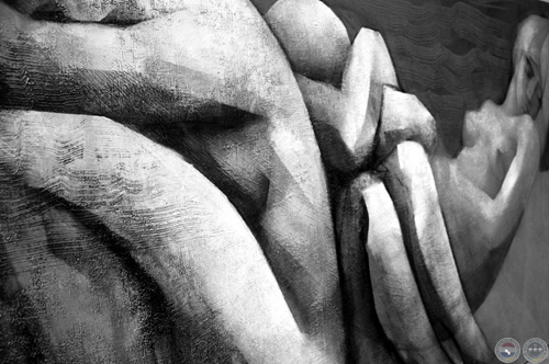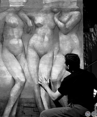 Esa metamorfosis se plasma en los cuadros siguiendo una línea temporal que va desde una referencia del cuerpo femenino tan clásica como “Las Tres Gracias”, perfectamente reconocibles y apenas enmascaradas por los surcos lineales que desvanecen sus rostros, hasta un desmembramiento que separa la figura humana como en piezas de un rompecabezas imposible.