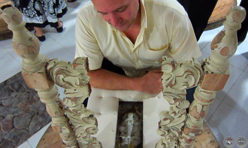 Silla que perdió parte de su respaldo tallado en madera