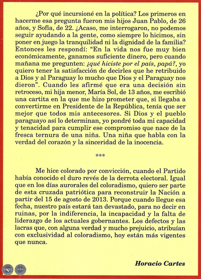 No es éste un programa de gobierno, es apenas un esbozo de las razones fundamentales que me impulsaron a afiliarme al Partido Colorado. Entre ellas, el deseo de contribuir para su retorno al poder en las elecciones generales de 2013, desde el lugar que el pueblo me asigne. Me siento, repito, plenamente identificado con el patriotismo que movilizó a los excombatientes de la Guerra Grande para fundar el Partido Colorado. Me convencen y conmueven la dignidad de su pueblo y la solidaridad de su gente.