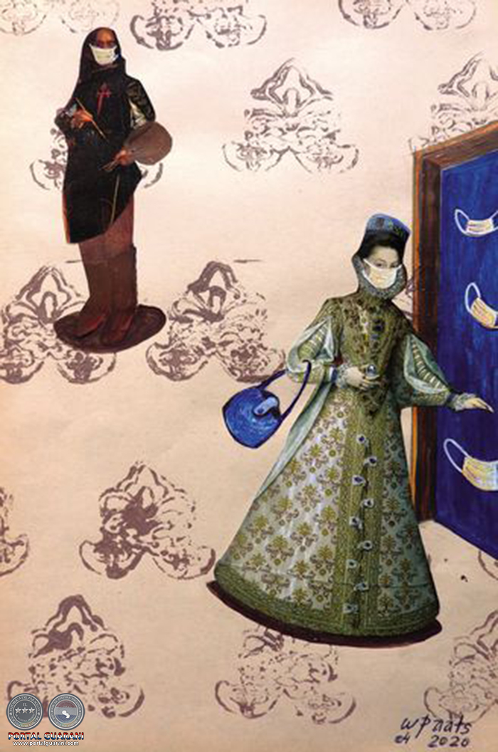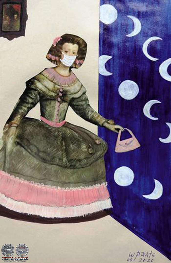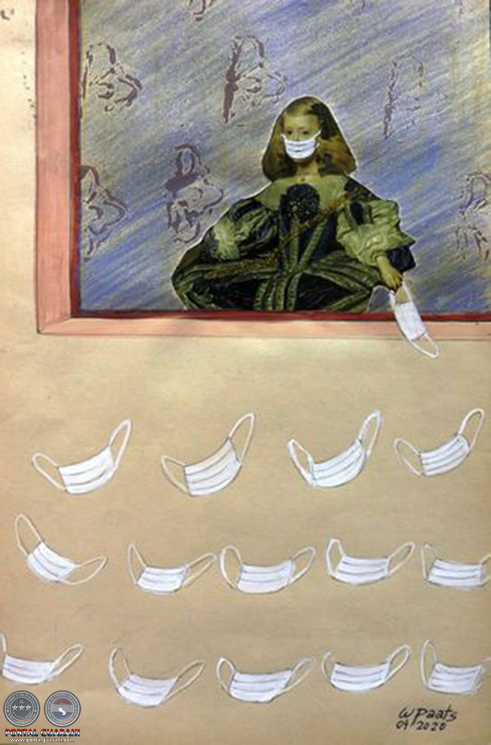 “Creo que los barbijos son como un símbolo de esta situación. En una de las obras sitúo los tapabocas abajo, representando al pueblo, y arriba se ve a la infanta, también con protector facial; en otra se observan dos ventanas de la corte, pero sus personajes están con tapabocas y forzados al distanciamiento físico; en otra, la menina va con una toalla en la mano, a lavársela, y aquí recurro a una antigua obra de mi autoría llamada La última gota, en la que se ve una canilla que despide una sola gota de agua”, va relatando al destacar que apela a la ironía en la construcción de todas estas obras.