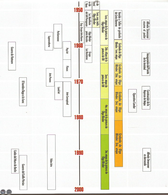 Esta investigación surge a partir de la inquietud de realizar una revisión y un análisis del trabajo de una artista plástica a lo largo de su carrera artística. Analiza la obra pictórica desarrollada por Olga Blinder desde sus inicios en la pintura y la utilización del lenguaje plástico como instrumento a través del cual manifestar inquietudes y cuestionamientos que surgen como consecuencia de un momento socio-político y artístico muy convulsionado de la historia paraguaya. Por las particularidades históricas de los acontecimientos se consideró muy importante investigar los sucesos ocurridos en el tiempo en el cual tuvo su desarrollo la carrera de la artista. Tiene como objetivo específico el análisis del trabajo y realizar un ordenamiento cronológico, formal y técnico de las obras realizadas con las técnicas pictóricas y sus diversas mezclas.