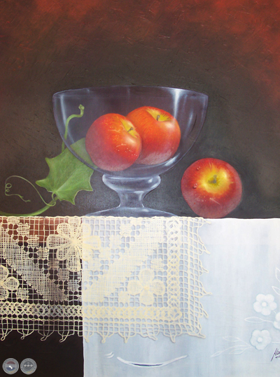 3 MANZANAS Y MANTELES, óleo sobre lienzo, 40 cm x 60 cm.