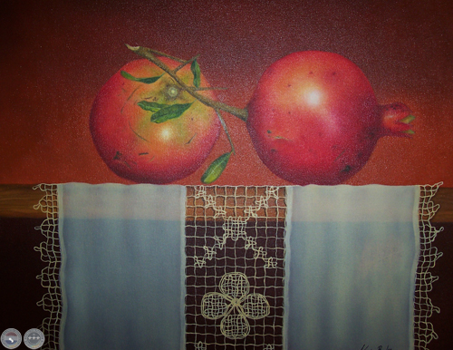 Granadas sobre encaje ju, óleo sobre lienzo, 60 cm x 40 cm.
