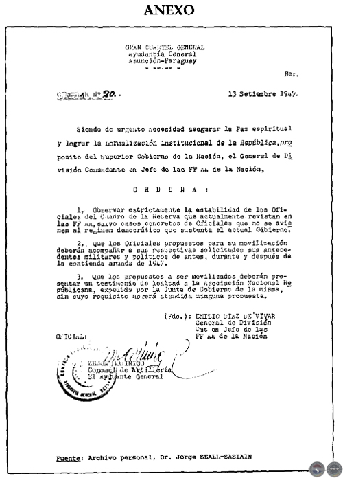 3. Que los propuestos a ser movilizados deberán presentar un testimonio de lealtada la Asociación Nacional Republicana (sic)[Partido Colorado], expedido por la Junta de Gobierno de la misma, sin cuyo requisito no será atendida ninguna propuesta.” [Énfasis agregado] Este es un documento inédito, cuya copia facsimilar se incluye en el anexo.
