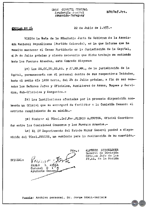 Esta medida fue ratificada por el General --en actividad-- Presidente Alfredo Stroessner, en la Circular N° 24 del 22 de julio de 1955, la que transcripta en su parte relevante expresa: