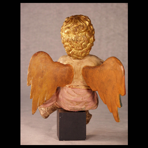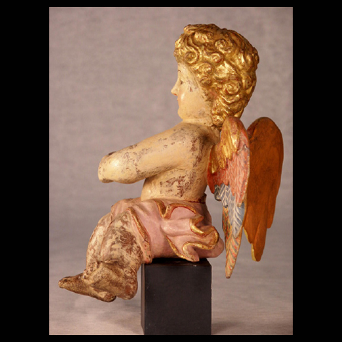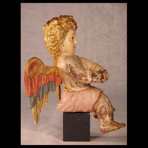 Representa a un ángel con alas de plumas coloridas, cabellos dorados y paño de color rosa. Es posible que esta pieza forme parte de un conjunto.