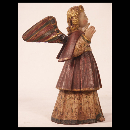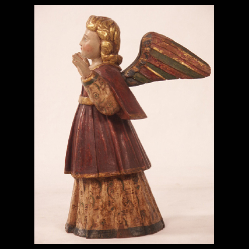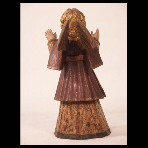Representa un ángel con túnica blanca, salpicada con motivos ornamentales fitomorfos, y sobretúnica rosa oscura.
