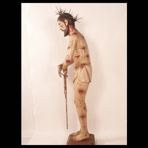 Tal factura resulta evidente en el tratamiento realista de la escultura y la aplicada calidad de su tallado. Sin embargo, el intento de una representación naturalista, conforme a los códigos clásicos, no puede impedir que se cuele la tendencia a la esquematización, basada en los códigos visuales indígenas. El Cristo de la Flagelación, cuya columna se ha perdido, se muestra erguido y sereno, casi altivo, indiferente al patetismo de la escena que protagoniza. Las manchas de sangre asumen la característica solución colonial que las hace aparecer como signos escuetos y simétricos, casi decorativos.
