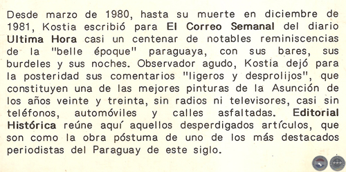 Sintetizar lo que Kostia representó para el periodismo de este país no es propósito de estas líneas introductorias. Pero nos atreveríamos a afirmar que en el Paraguay existió un periodismo antes de él y otro diferente después de él. Dispersa en cuartillas, revistas y diarios, queda una parte de su talento. Y aunque los comentarios aquí reunidos no representan lo más valioso de su producción son, en cambio, los más significativos.