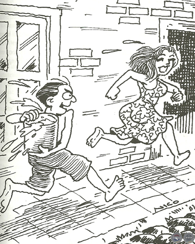 Fue en los carnavales de 1923, en plena revolución chirifista. Un edicto policial restringía las celebraciones, aun cuando autorizaba el juego con agua en horas de la siesta, con el que nos divertíamos grandes y chicos. Como el agua era mezquina y se mezquinaba, más aún en el rigor del verano, los muchachitos de mi barrio acostumbrábamos a desplazarnos, cada cual con su jarro de lata, hacia el "artesiano", una fuente pública situada en la pendiente de la calle Ayolas, la que sigo suponiendo que era naciente del arroyo Jaén, en el que, según las crónicas, recalaron las naves de la conquista. Allí había agua abundante y muchachas, que iban por ella, a quienes empapar.