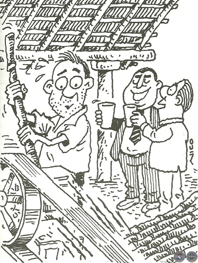 Su pequeño trapiche funcionaba incesantemente, ya que en los tiempos de Carosio eran desconocidos los cortes de energía, exprimiendo las cañas que los carreteros descargaban sobre una puerta lateral, todas las mañanas. Las traían, según me contaron alguna vez, de posta Yvycuá, donde se daban las más jugosas y aptas para la elaboración del tan paraguayo refresco. El opaco zumo caía en un gran recipiente de latón, del que derivaba a una larga serpentina de plomo refrigerada con una pesada barra de hielo y salía por una canilla, tan helado que nos producía una escalofriante sensación placentera en todo el cuerpo.