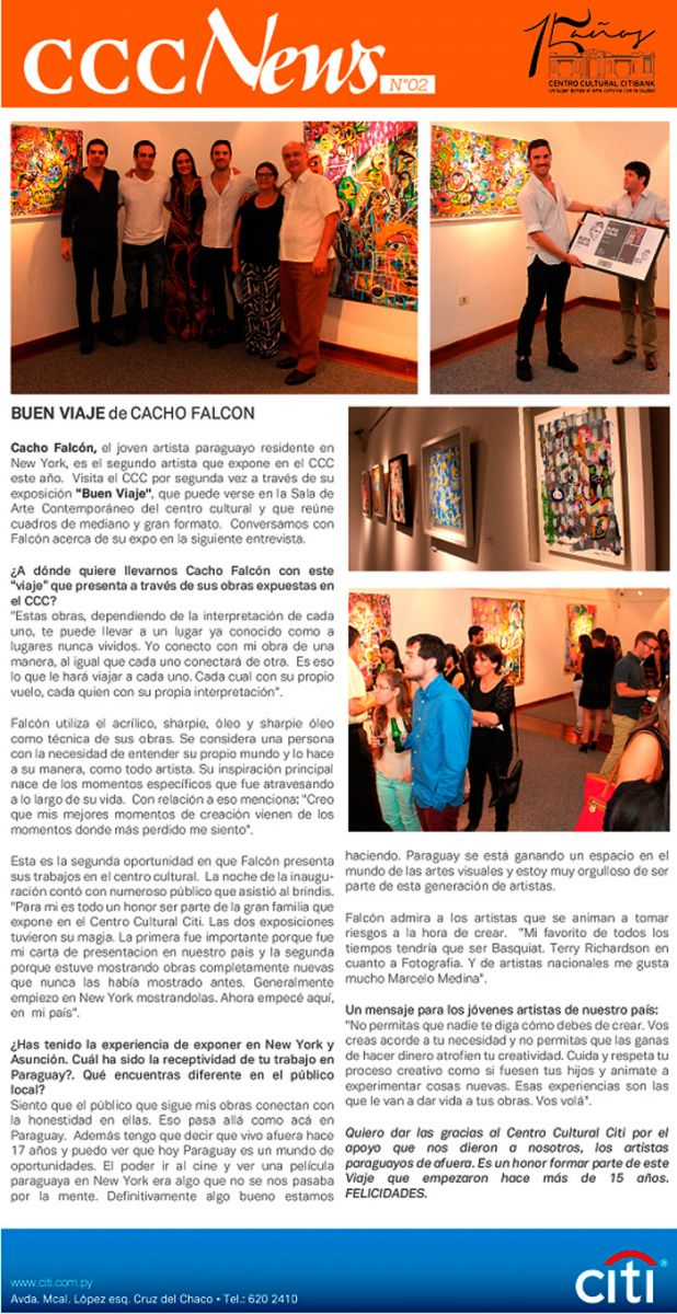 El jueves 5 de marzo a las 19:30 hs. se inauguró la muestra “Buen Viaje” del artista Cacho Falcón en el Centro Cultural Citibank (Mcal. López y Cruz del Chaco). La muestra está compuesta por pinturas y dibujos en mediano y gran formato de gran expresividad. La muestra estará habilitada hasta el 28 de marzo.