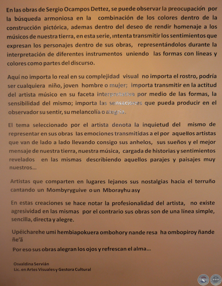 En las obras de Sergio Ocampos Dettez, se puede observar la preocupación por la búsqueda armoniosa en la combinación de los colores dentro de la construcción pictórica, además dentro del deseo de rendir homenaje a los músicos de nuestra tierra, en esta serie, intenta transmitir los sentimientos que expresan los personajes dentro de sus obras, representándolos durante la interpretación de diferentes instrumentos, uniendo las formas con líneas y colores como partes del discurso.
