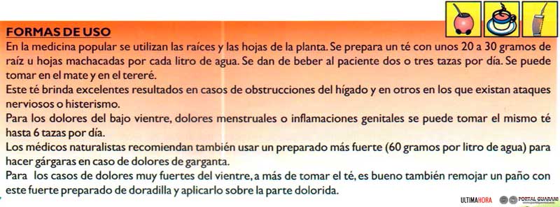 En Paraguay tenemos varios tipos de doradilla, la doradilla crespa o “pichaʼi", la del monte, y también una muy pequeña de los cerros llamada Ceterach officinarum. Esta especie la hemos encontrado en buena cantidad en la cordillera central, cerros de Tobatí y la cordillera de Mbaracayú, y todas necesitan de una urgente atención para que no se extingan definitivamente.