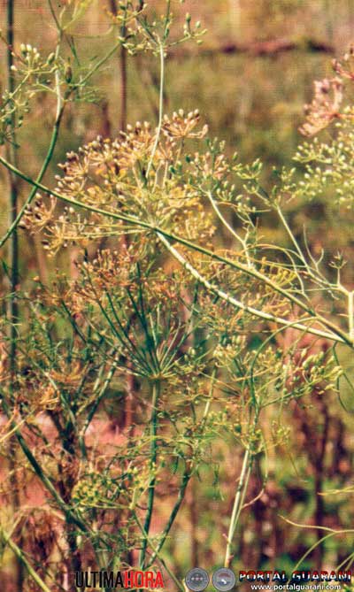 Tiene el tallo verde, hueco, liso y se ramifica en la punta sosteniendo un gran número de umbelas brillantes de flores amarillas. Sus hojas son muy finas, semejantes a plumas de color verde oscuro. Pertenece a la familia de las umbelíferas y, según los botánicos, es originario de Persia y la India.
