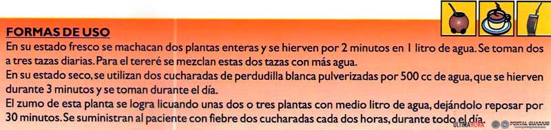 Las personas que sufren de gripe, fiebre, inflamaciones de la garganta, problemas del pecho, ardores del estómago, tos y catarro encontrarán muy beneficiosos los principios activos medicinales que aporta la perdudilla blanca.
