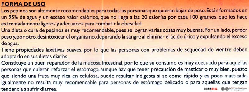 Así pues, resulta muy adecuado para pieles que han sufrido las consecuencias de una exposición prolongada al sol. Una buena manera de realizar una crema suavizante después de una fuerte exposición solar consiste en triturar un par de pepinos con una batidora y extender la pulpa triturada en forma de crema sobre la piel enrojecida durante media hora o tres cuartos de hora. Este mismo tratamiento resulta muy adecuado para aliviar pieles que sufren dermatitis o quemaduras no solares. La aplicación de esta pasta sobre los rostros juveniles afectados de acné mejora su aspecto y reduce el número de granos.