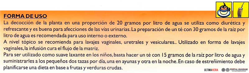 Esta plantita de nuestras primaveras tiene excelentes propiedades antiinflamatorias, es diurética, útil en el tratamiento de la hidropesía y en las enfermedades de las vías urinarias (riñón, vejiga). Es también un suave laxante, muy indicado para tratar problemas de estreñimiento en los niños. E un remedio natural refrescante, ideal para el tereré.