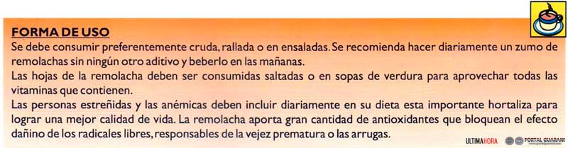 La remolacha o betabel de mesa que se cultiva de forma extensa posee una raíz globular o napiforme. Su valor alimenticio se debe a que contiene un 10% de carbohidratos. También contiene pequeñas cantidades de proteínas, grasa, fibra y ceniza, y sus hojas son ricas en vitaminas. Otra variedad cultivable de la remolacha es la remolacha azucarera. Esta posee raíces blancas, cónicas y de gran tamaño que contienen un alto porcentaje de azúcar. La remolacha es un alimento y medicamento del que no se debería prescindir. Es muy energética y muy aconsejada para casos de anemia, enfermedades de la sangre y para casos de convalecencia, debido a su alto contenido en hierro. También es rica en azúcares, vitaminas C y B, potasio y carotenos. La azúcar contenida en la remolacha es la sacarosa. Para aprovechar todas sus propiedades nutricionales y medicinales se la debe consumir siempre cruda o en forma de jugo natural o con miel. Es muy recomendada para casos de raquitismo en los niños. Tiene propiedades laxantes, por lo que combate el estreñimiento y las molestas hemorroides. Es también un excelente remedio natural para mejorar la función hepática y tratar las infecciones en la vejiga urinaria.