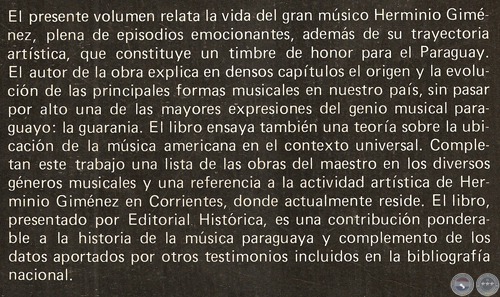 Este libro no es solamente una exhibición o historial de las obras de Herminio Giménez; es más, constituye la etopeya del mismo. Se ha adentrado en la filosofía de la música del biografiado, ha desentrañado su sentido logrando llegar hasta su fuero espiritual. Eso es mucho y es todo.