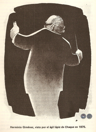¿Solamente un picachón en el itinerario de la música folklórica? Nada de eso, también su humanidad ejemplar, y el corazón, a veces, hace zancadillas, empujando a la pluma a una alocada carrera. El parto, accidentado, había tumbado a Irma Solís, solista de la Orquesta, acercándola peligrosamente al desenlace fatal. Su juventud y un famoso cirujano consiguieron salvarla. Poco después, recuerdo, cuando a duras penas se reponía la cantante, en la casa de las afueras donde vivíamos, comenzó a oírse, de pronto, una canción de cuna que venía como de lejos, traída por el viento desde algún receptor. Abrimos; era Herminio, a la cabeza de sus musicales huestes, que venía a celebrar la derrota de Calibos y los demonios del pantano. Nunca olvidaré esa noche, porque todo arte es realmente ese algo que nos permite vivir por encima de la muerte. La presencia, allí, sonriente, llorosa y plena de júbilo, de Herminio Giménez, constituía su testimonio vivo.
