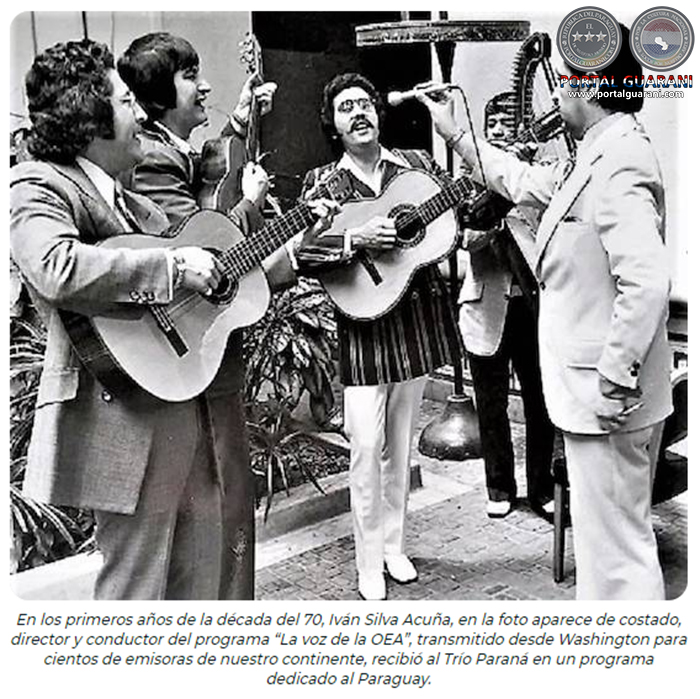 En los primeros años de la década del 70, Iván Silva Acuña, en la foto aparece de costado, director y conductor del programa “La voz de la OEA”, transmitido desde Washington para cientos de emisoras de nuestro continente, recibió al Trío Paraná en un programa dedicado al Paraguay.