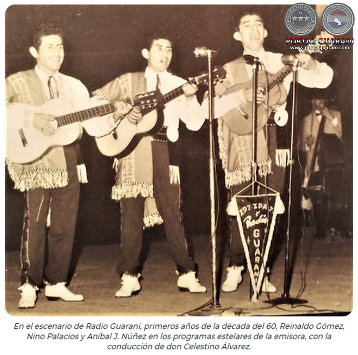 En el escenario de Radio Guaraní, primeros años de la década del 60, Reinaldo Gómez, Nino Palacios y Aníbal J. Núñez en los programas estelares de la emisora, con la conducción de don Celestino Álvarez.