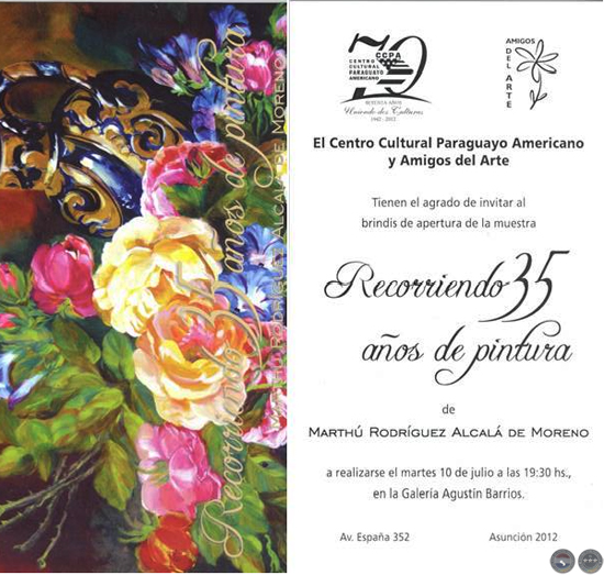 El Centro Cultural Paraguayo Americano y Amigos del Arte, inauguraron el martes 10 de julio a las 19:30 hs. la exposición de pintura titulada “Recorriendo 35 años de pintura”, de la artista paraguaya Marthú Rodríguez Alcalá de Moreno, en la Galería Agustín Barrios del CCPA, en Av. España 352. La exposición puede ser vista hasta fin de mes, en horario de lunes a viernes de 9 a 20 hs.