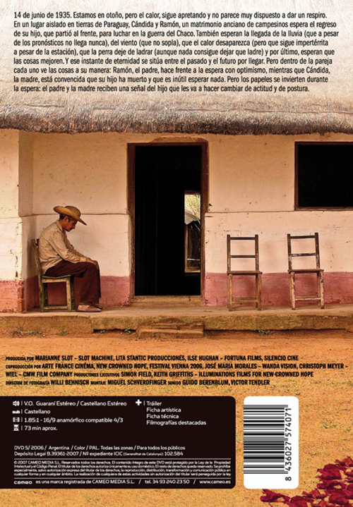 SINOPSIS: 14 de junio de 1935. En un lugar aislado en tierras de Paraguay, Cándida y Ramón, un matrimonio anciano de campesinos, esperan el regreso de su hijo, que partió al frente para luchar en la Guerra del Chaco. También esperan la llegada de la lluvia (que a pesar de los pronósticos no llega nunca), del viento (que no sopla), que el calor desaparezca (que sigue impertérrito a pesar de la estación), que la perra deje de ladrar (aunque nada consigue dejar que ladre), y, por último, esperan que las cosas mejoren. Y ese instante de eternidad se sitúa entre el pasado y el futuro por llegar. Pero dentro de la pareja cada uno ve las cosas a su manera: Ramón, el padre, hace frente a la espera con optimismo, mientras que Cándida, la madre, está convencida de que su hijo ha muerto. Sin embargo, los papeles se invierten durante la espera: el padre y la madre reciben una señal del hijo, que les va a hacer cambiar de actitud y postura. (FILMAFFINITY)