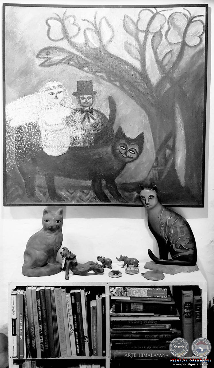 Nos cuenta Lucy: “Mi marido el Dr. Caballero Gatti decía: los gatos tienen mucho que enseñarnos”, es así, en cada rincón de su hogar hay uno que nos invita a ser más humanos, pinturas de felinos de famosos artistas latinoamericanos acompañan las paredes del hogar, como los de los uruguayos Jorge Páez Vilaró y Luis Solari, gloriosas piezas de barro de Areguá, hasta un “autorretrato, con ramo de flores y un gato”, de Mabel Arcondo, que amaba los gatos, tal vez por su imposibilidad de caminar –debido a una poliomielitis– y llegar a lo más alto de la “techumbre” como lo hacen estos amorosos cuadrúpedos con tanta agilidad.