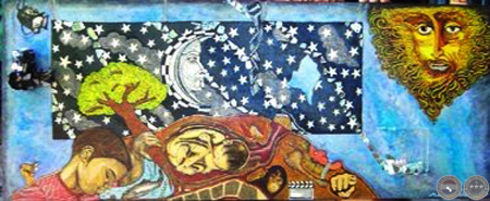 Un sol y una luna pintados con rostros logran un contraste y el equilibrio para la "VIDA".