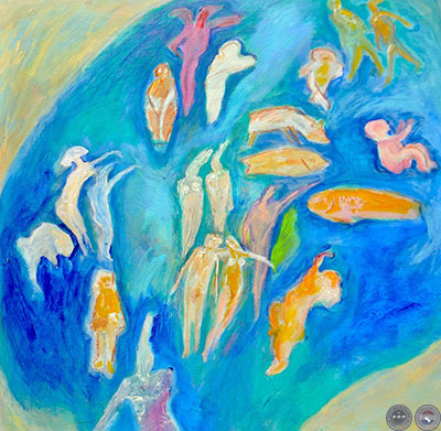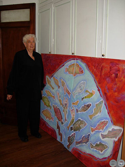 Si bien casi todos los exponentes son de nacionalidad paraguaya, hemos incluido algunos nombres de artistas internacionales por sus vínculos –a veces muy fuertes, como es el caso de Susana Romero–, con el Paraguay. Susana pasó 20 años aquí (1968-1988) donde no solo enseñó –en su propio taller de su casa y en el Centro de Artes Visuales–, sino que participó en numerosos exposiciones representando al Paraguay en varias bienales y exposiciones internacionales. Actualmente sigue exponiendo y pintando en la Argentina, pero más relajadamente. Últimamente está trabajando sobre una serie de pinturas de sus nietos y, como fondo, el campo argentino. Desde hace mucho tiempo, la mayoría de la obra de Susana, lleva una “estampa” esotérica: ángeles, seres de otros mundos, peces que nadan entre las figuras. También la gama de colores que está utilizando ha subido de tono… Ya no son los colores –más bien tenues de antes–, las violetas y azules que acostumbramos asociar con sus pinturas. Susana vive con su marido Jorge, entre Buenos Aires y Córdoba.