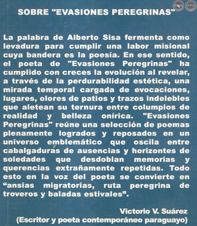 La palabra de Alberto Sisa fermenta como levadura para cumplir una labor misional cuya bandera es la poesía. En ese sentido, el poeta de EVASIONES PEREGRINAS ha cumplido con creces la evolución al revelar, a través de la perdurabilidad estética, una mirada temporal cargada de evocaciones, lugares, olores de patios y trazos indelebles que aletean su ternura entre columpios de realidad y belleza onírica. EVASIONES PEREGRINAS reúne una selección de poemas plenamente logrados y reposados en un universo emblemático que oscila entre cabalgaduras de ausencias y horizontes de soledades que desdoblan memorias y querencias extrañamente repetidas. Todo esto en la voz del poeta se convierte en “ansias migratorias, ruta peregrina de troveros y baladas estivales”