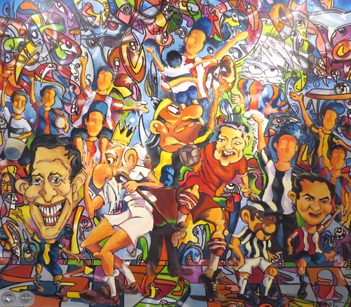 Así va surgiendo de esta maraña, la expresión figurativa de representación simbólica, sus preferidos personajes “del mundo de la cultura” y de esas “estrellas del fútbol”, sus dos pasiones, que de alguna manera han dejado una impronta en su vida; amalgamados con fulgurantes colores llenos de pasión, trasladándolos en lugar del muro sobre la tela y objetos.”