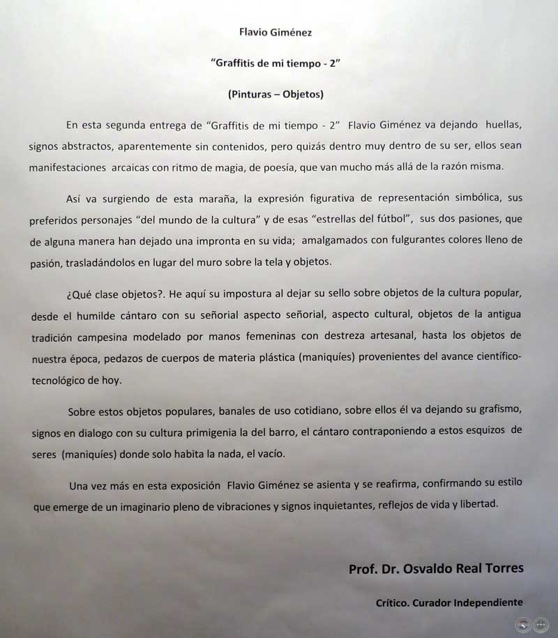 Acerca de su obra, el curador de la muestra, Prof. Dr. Osvaldo Real Torres escribe lo siguiente: “En esta segunda entrega de “Graffitis de tiempo – 2” Flavio Giménez va dejando huellas, signos abstractos, aparentemente sin contenidos, pero quizás dentro muy dentro de su ser, ellos sean manifestaciones arcaicas con ritmo de magia, de poesía, que van mucho más allá de la razón misma.