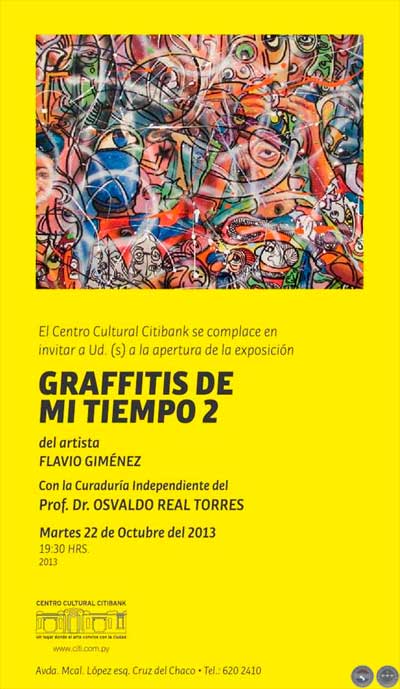 El martes 22 de octubre (2013) se inauguró la muestra del artista Flavio Giménez que lleva como título “Graffitis de mi tiempo II”, bajo la curaduría del Prof. Dr. Osvaldo Real Torres, curador y crítico independiente. Esta muestra compuesta por pinturas y objetos puede visitarse en el Centro Cultural Citibank (Mcal. López y Cruz del Chaco), donde permanecerá habilitada por espacio de dos semanas.