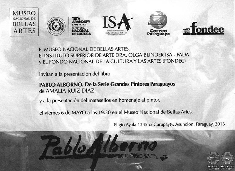 El próximo viernes, 6 de mayo a las 19:00 horas, en el Museo Nacional de Bellas Artes (MNBA, Eligio Ayala 1345 e/ Pa’i Pérez y Curupayty) será presentado el libro “Pablo Alborno, de la serie Grandes Pintores del Paraguay”, escrito por la profesora Lic. Amalia Ruiz Díaz.